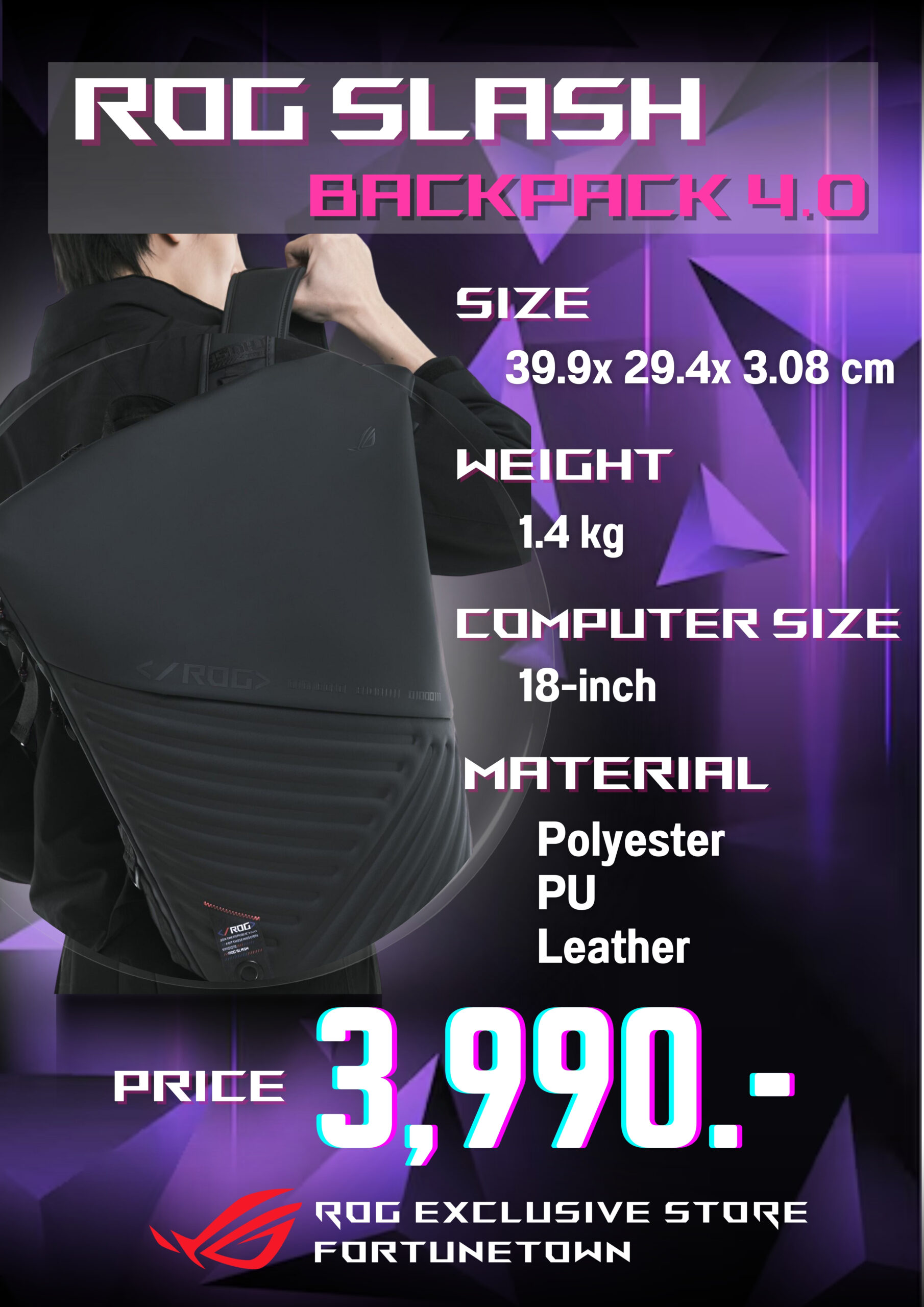 ชีวิตมักพาคุณไปยังที่ที่ไม่คาดคิด และกระเป๋าเป้ ROG SLASH Backpack 4.0 ก็พร้อมเดินทางไปกับคุณ ผลิตจากวัสดุคุณภาพสูง พร้อมด้วยพื้นที่เก็บของที่รองรับโน้ตบุ๊กขนาด 18” และดีไซน์แบบ roll-top ช่วยเพิ่มความยืดหยุ่นในการจัดเก็บสำหรับทั้งทริปสั้นและทริปยาว